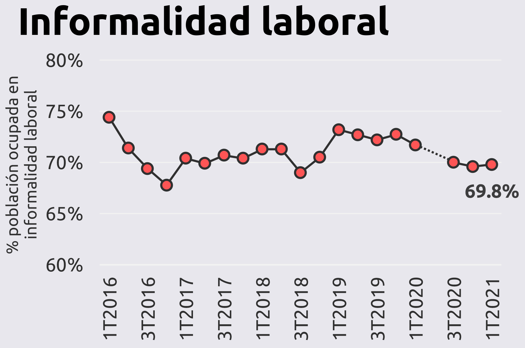Guerrero tiene la 2.ª tasa más alta de informalidad nacional, ya que 69.8 % de los trabajadores del estado tienen un empleo sin prestaciones laborales o vínculo reconocido. La tasa nacional fue de 50.8 % en el 1T2021.