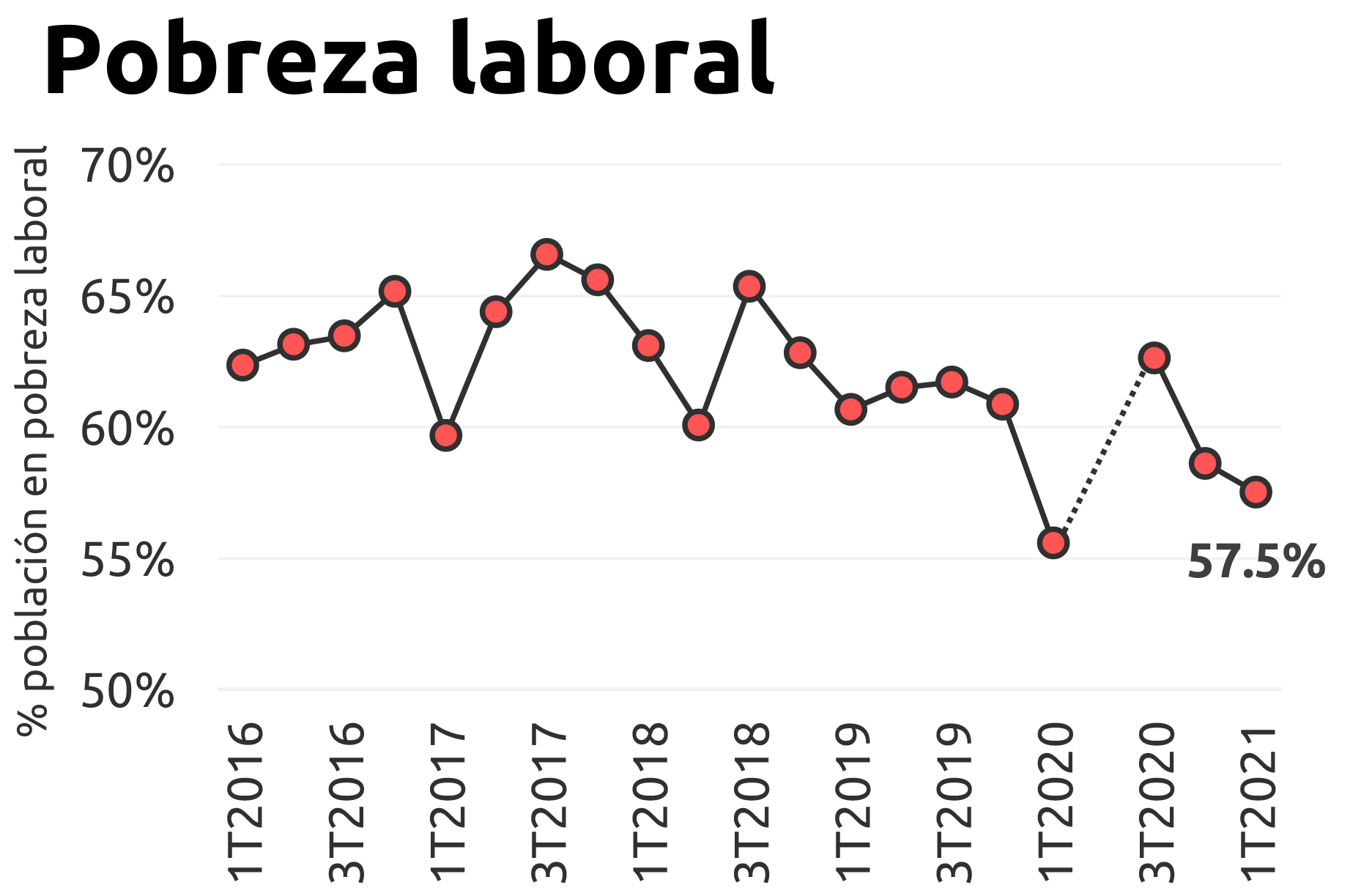 Con 57.5 % de su población en pobreza laboral (con ingresos laborales del hogar insuficientes para cubrir necesidades alimentarias mínimas), Guerrero es el 2.º estado con peor desempeño en México, y su nivel aumentó 1.9 puntos respecto al 1T2020.