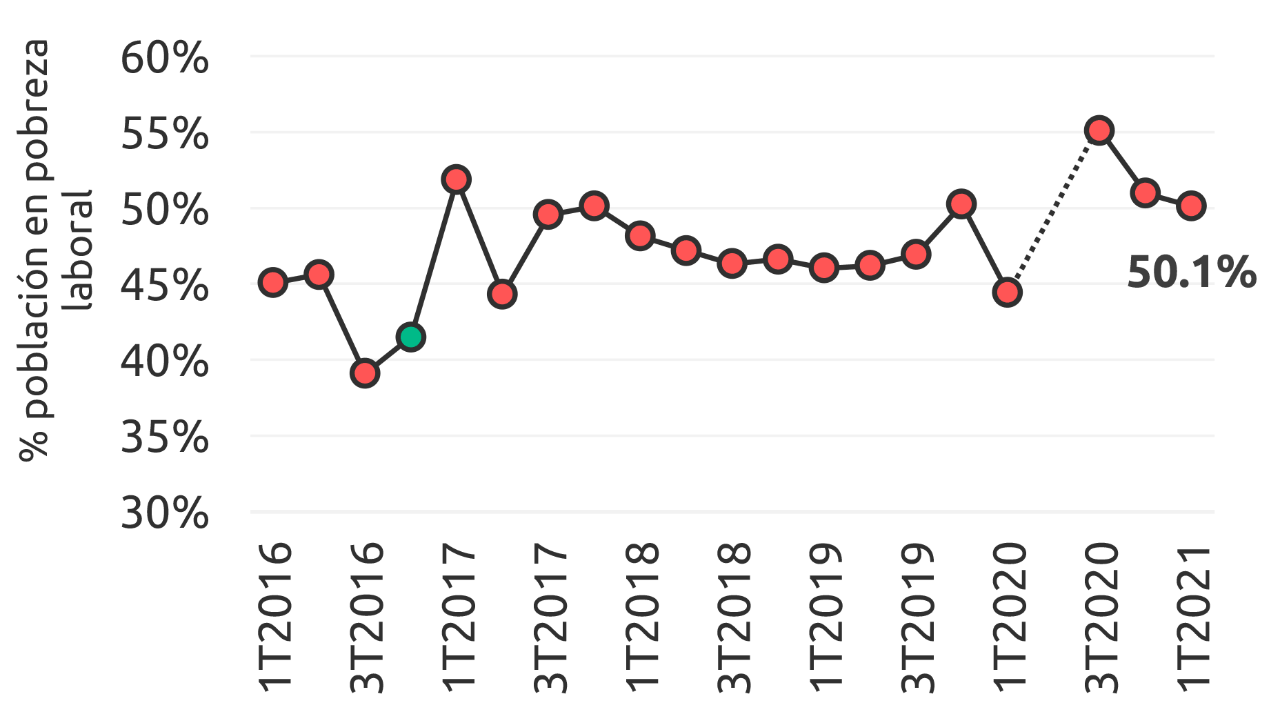 Con 50.1 % de su población en pobreza laboral (con ingresos laborales del hogar insuficientes para cubrir necesidades alimentarias mínimas), Hidalgo es el 5.º estado con peor desempeño en México, y su nivel aumentó 5.8 puntos respecto al 1T2020.