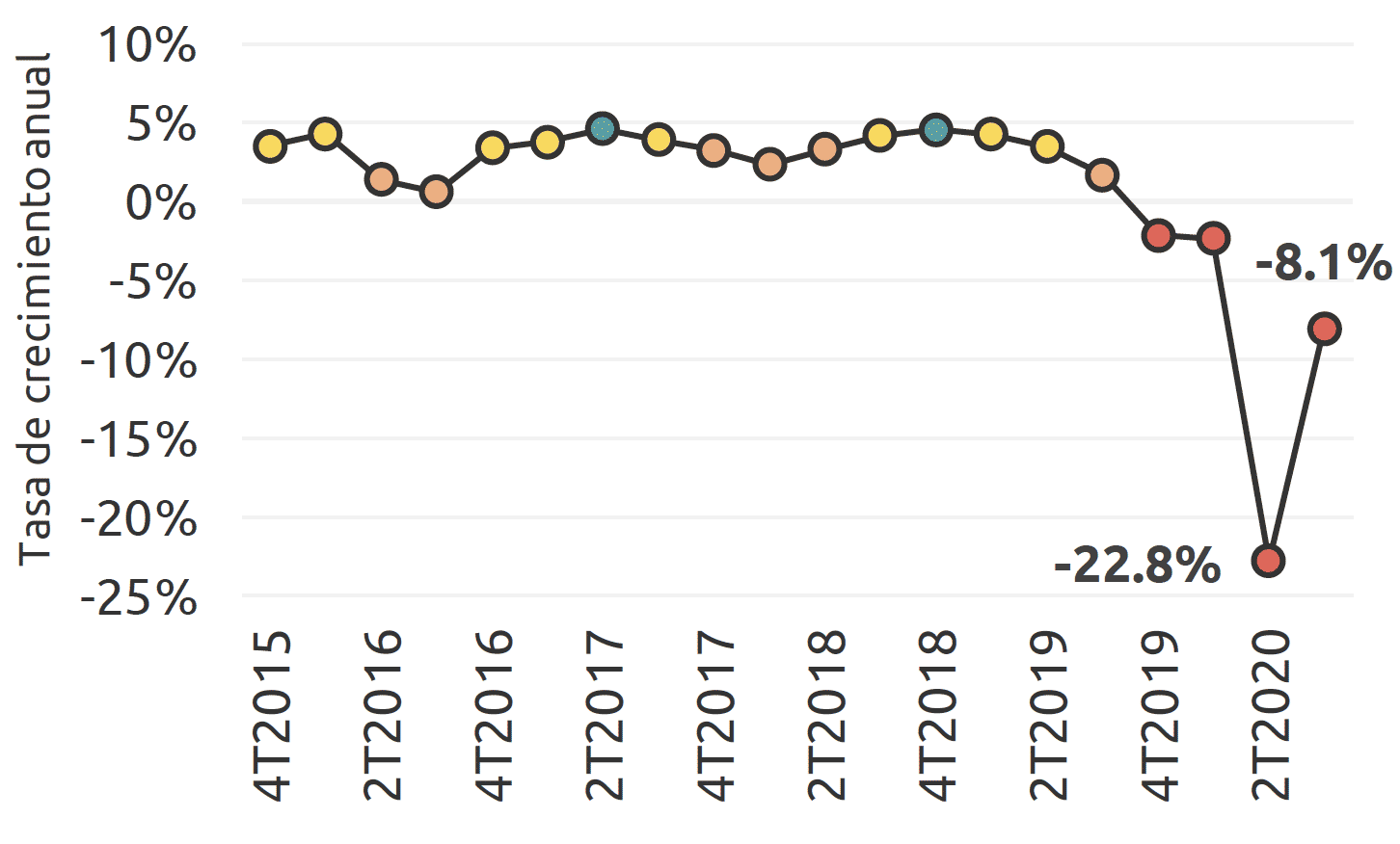 En los primeros 3 trimestres de 2020, la economía de NL se contrajo (-)11.1 % anual, en promedio. Previo a esto, su economía había crecido a una tasa promedio de 2.9 % anual entre 2016 y 2019.