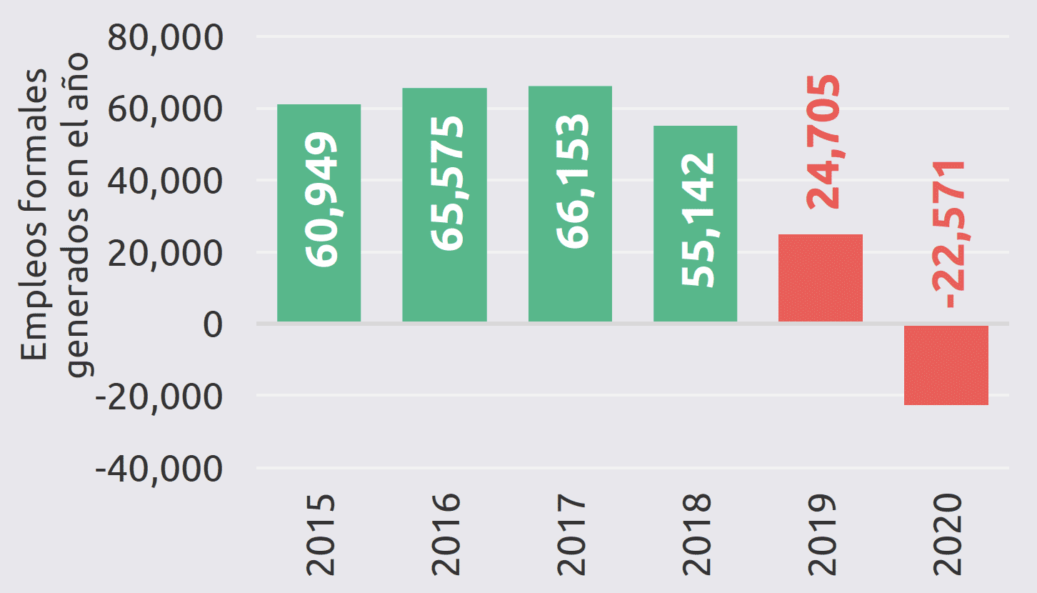 En 2020, NL borró 1.4 % de su registro de empleos asegurados ante el IMSS; fue la entidad con la 7.ª pérdida menos pronunciada a nivel nacional. No se generaron empleos necesarios para incorporar a los jóvenes que entran al mercado laboral.