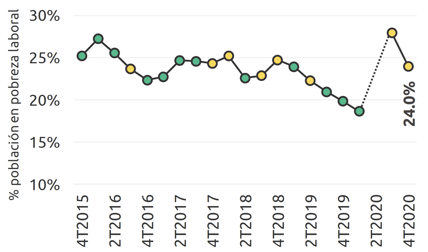 Con 24 % de su población en pobreza laboral (con ingresos laborales del hogar insuficientes para cubrir necesidades alimentarias mínimas), NL es el 1er estado con mejor desempeño en México, aún con un aumento de 4.1 puntos respecto al 4T2019.