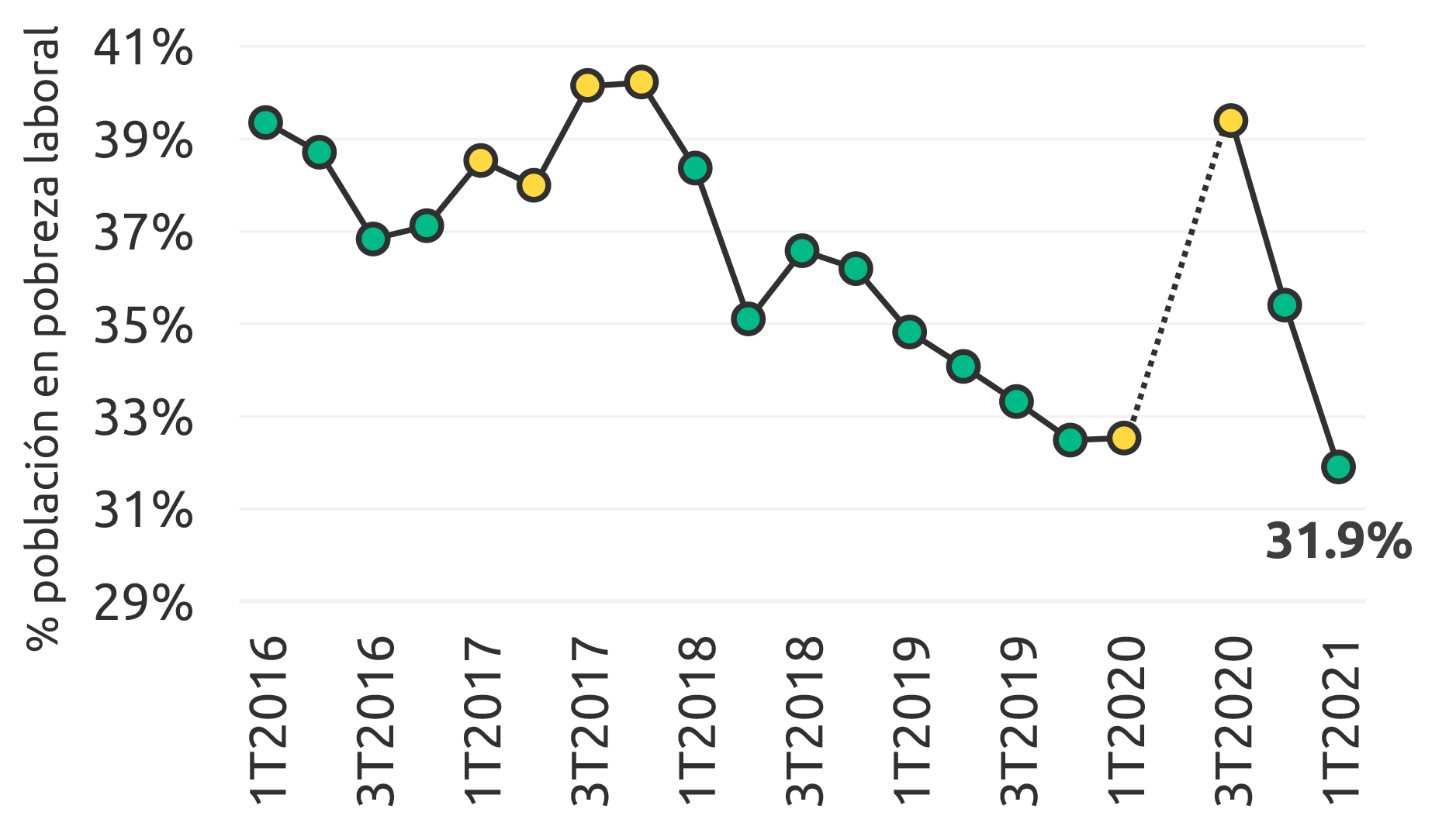 Con 31.9 % de su población en pobreza laboral (con ingresos laborales del hogar insuficientes para cubrir necesidades alimentarias mínimas), Tamaulipas es el 11.º estado con mejor desempeño en México, y su nivel cayó 0.5 puntos respecto al 1T2020.