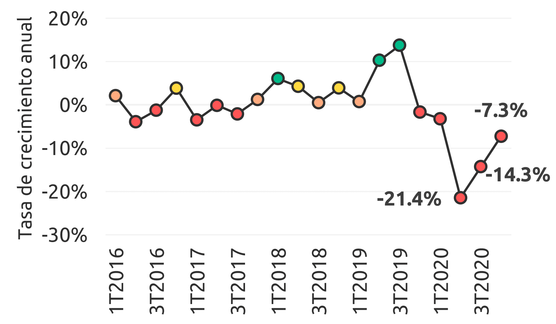 Durante 2020, la economía de Tlaxcala se contrajo (-)11.6 % anual, con una caída pronunciada en el 2T2020. Previo a esto, su economía había crecido a una tasa promedio de 2.1 % anual entre 2016 y 2019.