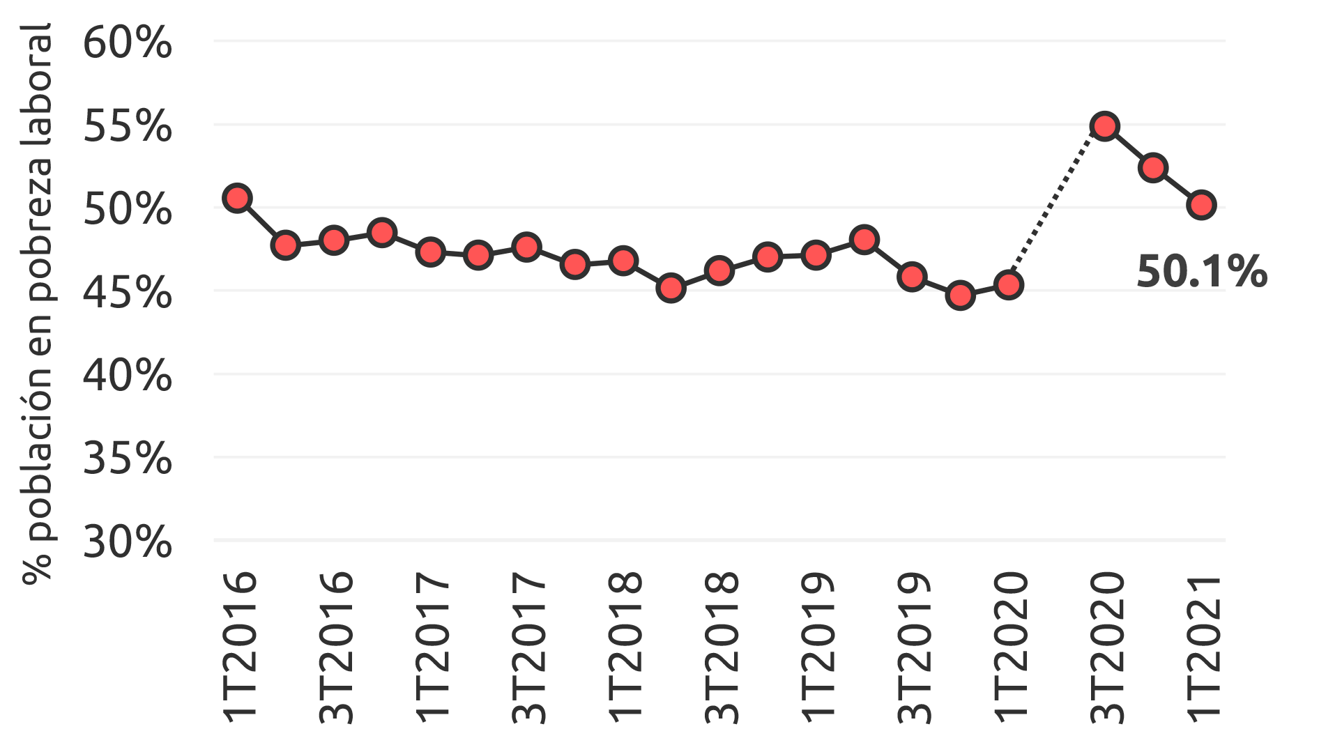 Con 50.1 % de su población en pobreza laboral (con ingresos laborales del hogar insuficientes para cubrir necesidades alimentarias mínimas), Tlaxcala es el 4.º estado con peor desempeño en México, y su nivel aumentó 4.9 puntos respecto al 1T2020.