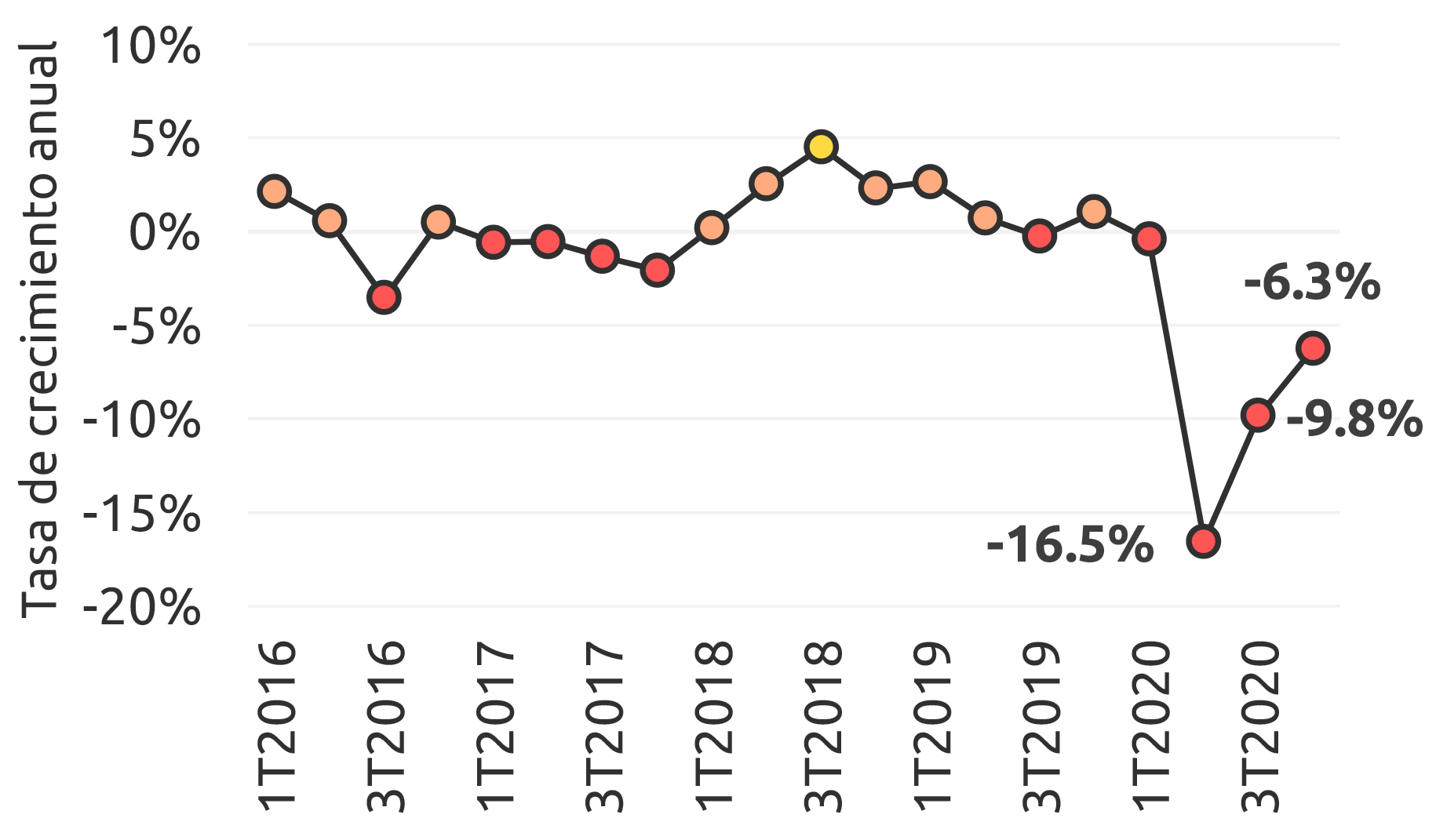 Durante 2020, la economía de Veracruz se contrajo (-)8.3 % anual, con una caída pronunciada en el 2T2020. Previo a esto, su economía había crecido a una tasa promedio de 0.5 % anual entre 2016 y 2019.