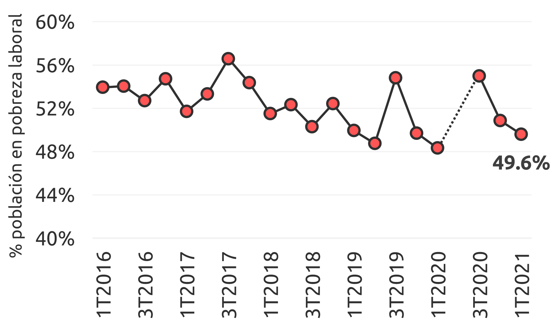 Con 49.6 % de su población en pobreza laboral (con ingresos laborales del hogar insuficientes para cubrir necesidades alimentarias mínimas), Veracruz es el 6.º estado con peor desempeño en México, y su nivel aumentó 1.4 puntos respecto al 1T2020.